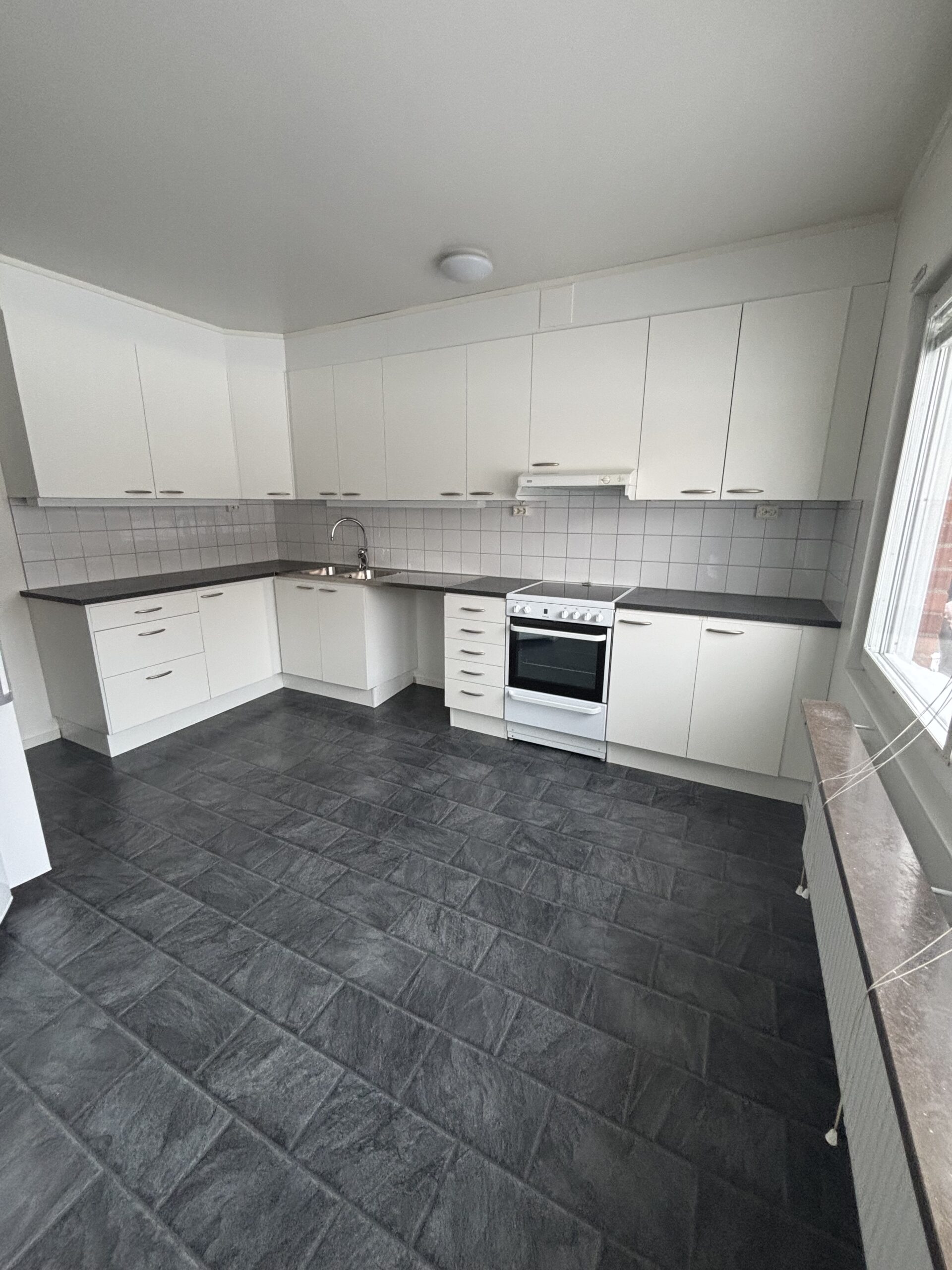 Lägenheten har genomgående vita väggar, ett funktionellt kök.