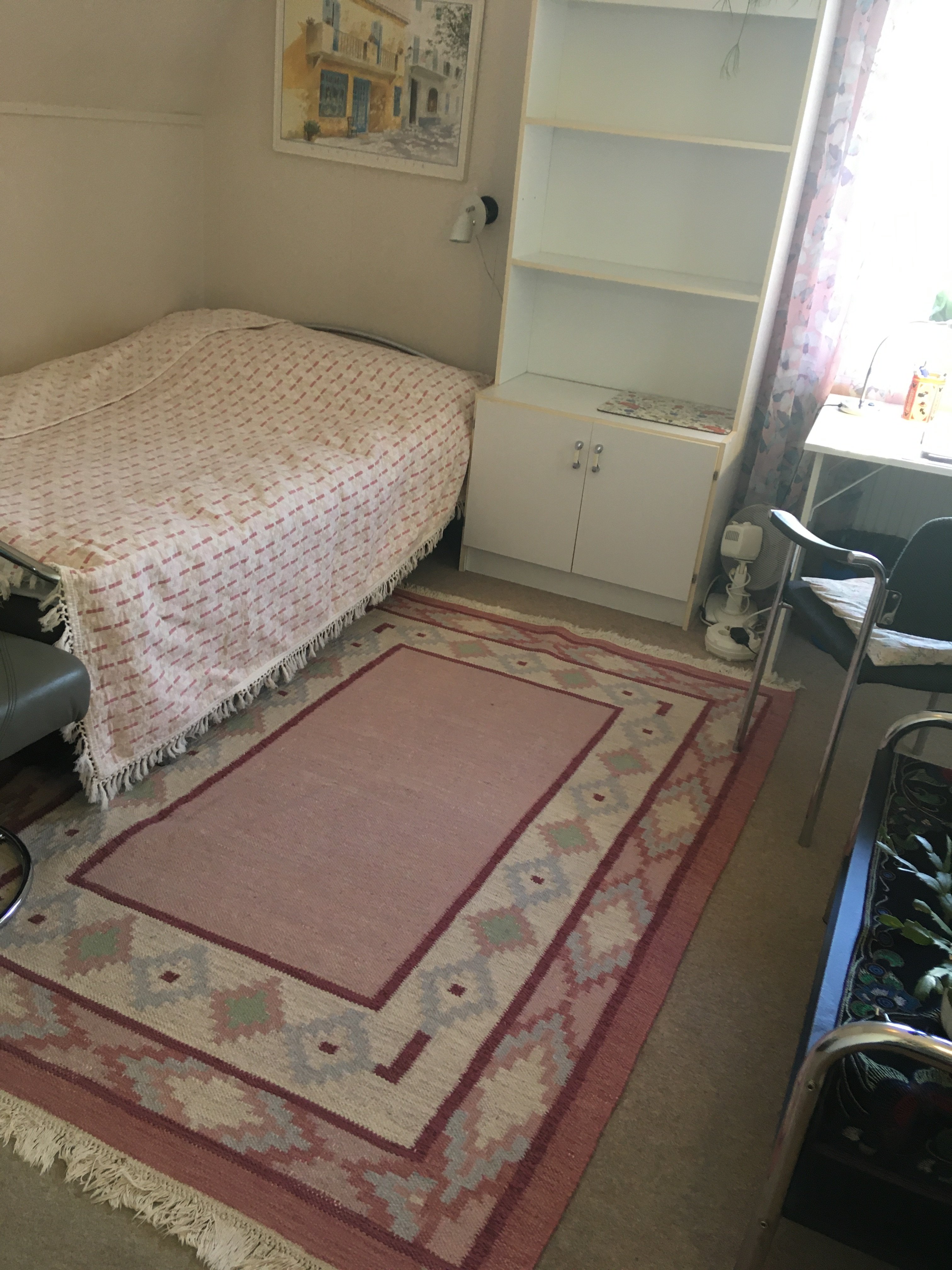 Möblerat rum på övervåningen i en villa uthyres till skötsam kvinnlig studerande. El, värme, internet ingår i hyran. En bred 120 cm säng, skrivbord, fåtölj, garderob, mm. Egen toalett och badrum. Gemensamt kök och tvättstuga. Nära till buss, centrum, Northvolt och lasarettet. Lugnt område.