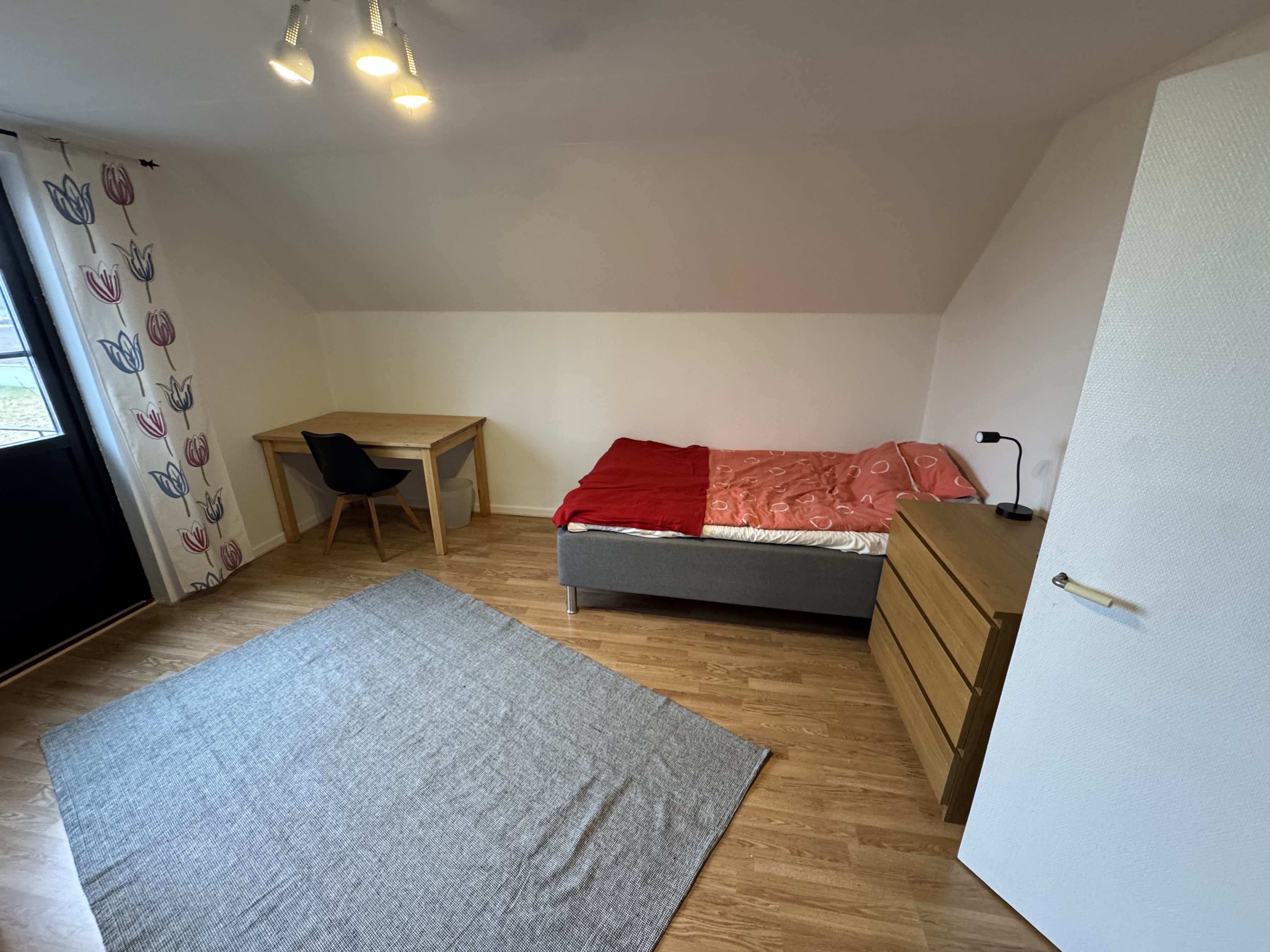 Huset är i två våningar med totalt fem rum. Rummet som hyrs ut ligger på övervåningen och är cirka 20 kvm – rymligt, ljust och med bra förvaringsmöjligheter.
