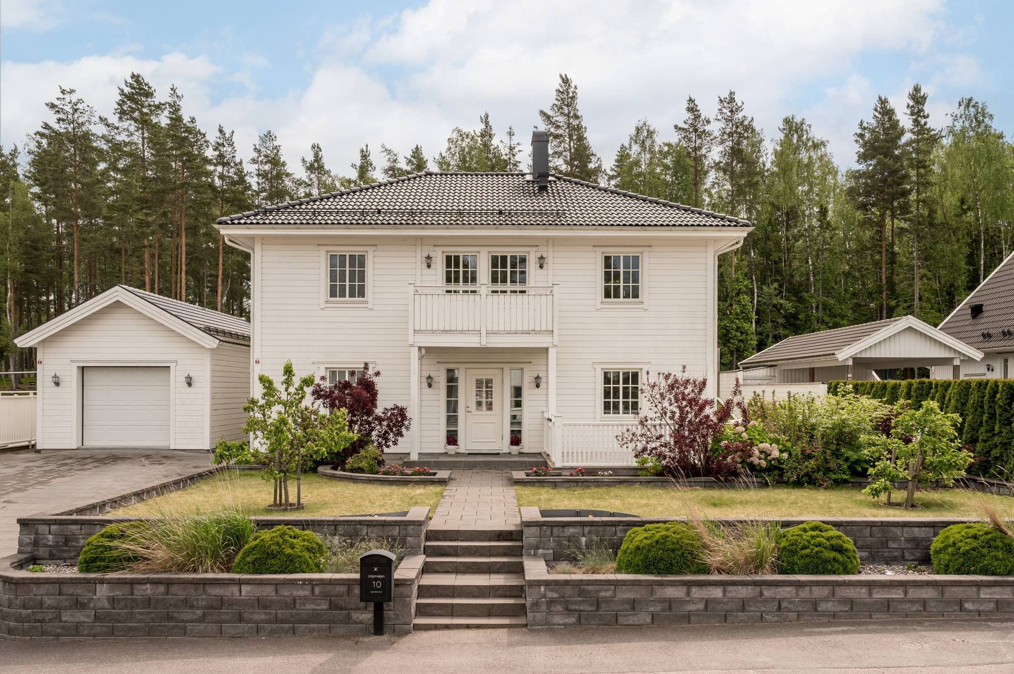 Trädgården är välskött och inbjudande med altan i flera väderstreck – perfekt för att njuta av långa sommarkvällar. Här finns även separat förråd med egen uteplats och pergola. Framsidan pryds av vackra planteringar i etage och bilen parkerar du bekvämt i garaget eller på den stenlagda uppfarten.