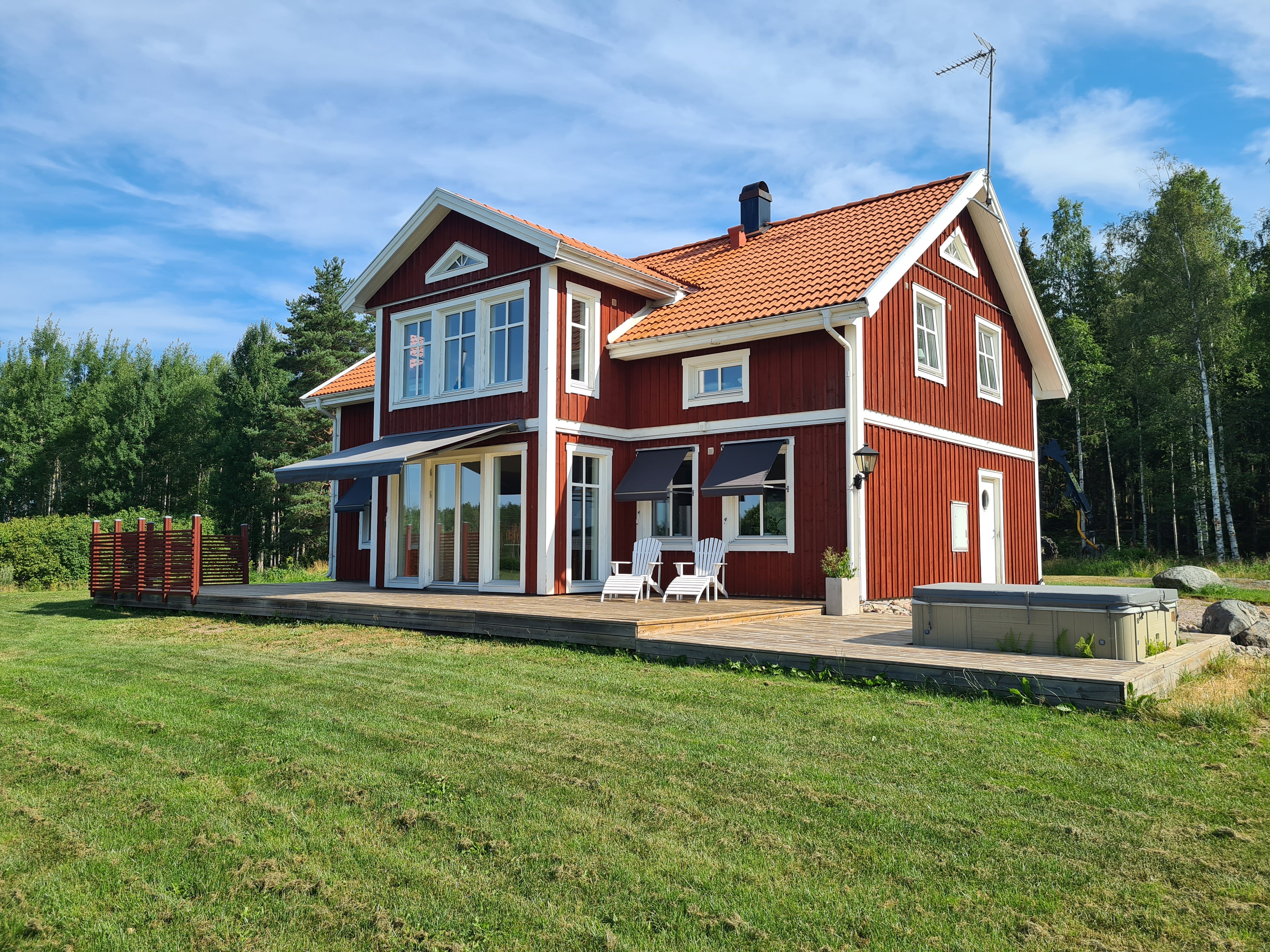 Vi hyr ut vår stora (210 kvm) och moderna villa utanför Avesta. Huset ligger i anslutning till vår gård på en höjd med härlig utsikt över omgivande landskap och hästhagar. Huset består av två våningar med öppen planlösning, braskamin, generösa sällskapsytor för upp till 8 personer, stor uteplats med grill samt stor trädgård. Huset är fullt möblerat och består av: - Fullt utrustat kök (kyl, frys, spis, diskmaskin, micro inkl porslin och köksredskap) - Fullt utrustad tvättstuga (tvättmaskin, torkskåp och torktumlare), - Två badrum med dusch och toalett (det ena med bastu och badkar) - 4 separata...
