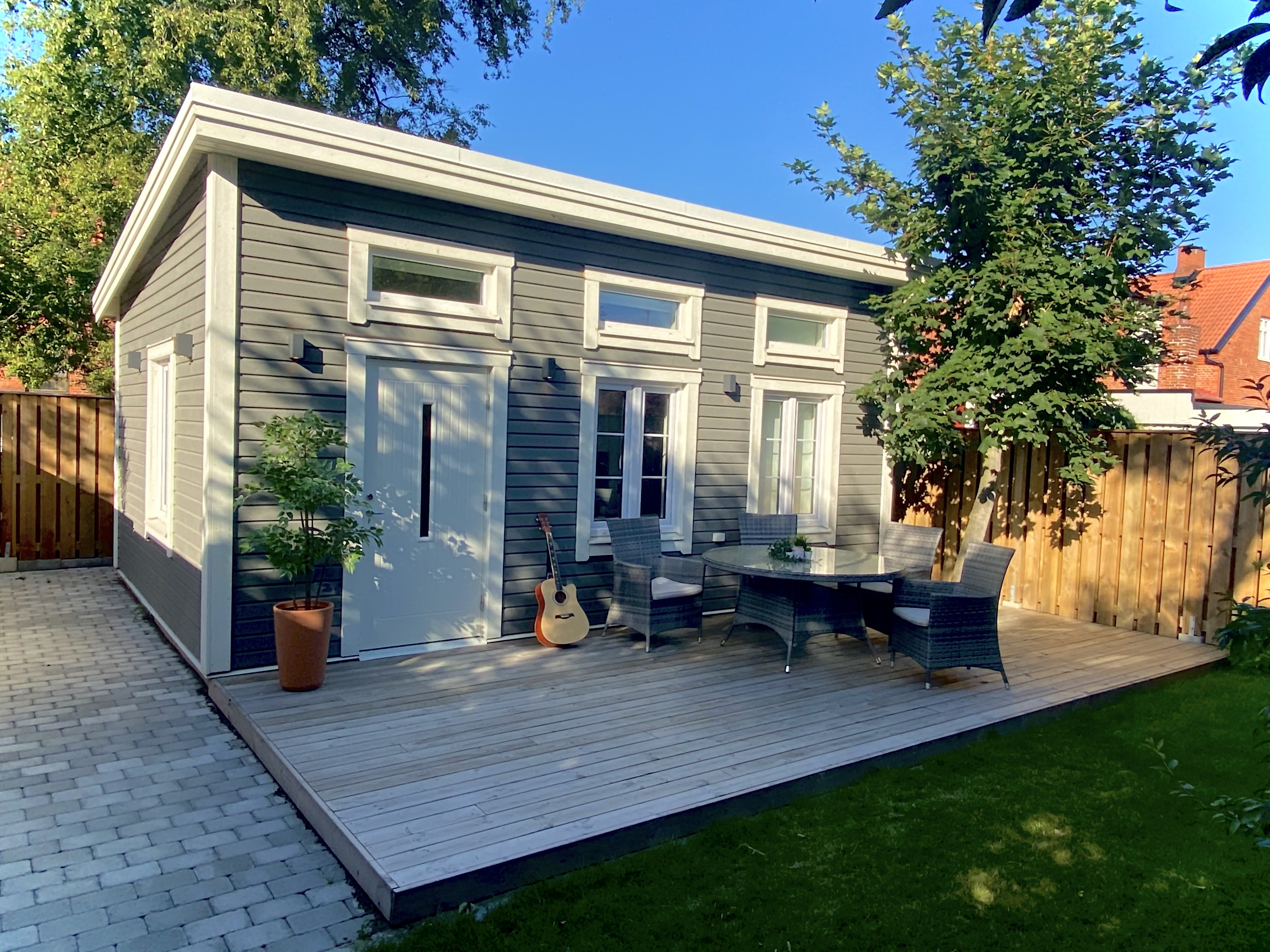 Attefallshus hel bostad med egen trädgård. Centralt i Trelleborg Sovrum . Allrum med kök . Badrum med tvätt och tork.